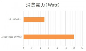 ある程度トラフィックが流れている状態での消費電力の測定をしたかったが、スイッチに高い負荷をかける術がないので待機時の消費電力を比較してグラフを描いてみた。結果は、大体カタログスペック通りの消費電力だった。